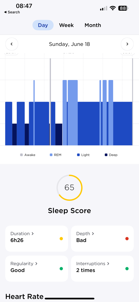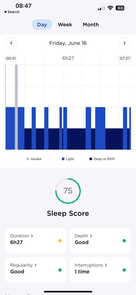 Friday night (Saturday, June 17 on the images), I got a score of 36, but that’s mainly because I didn’t get to bed until after midnight. Saturday and Sunday night, though, I got scores of 65 and 53, which are better than my pre-treatment sleep scores, but not by much, and mainly because the sleep depth was bad. I think this is because I had some better sleep hygiene routines at the other place I’m staying that I’m not following through here. I’m keeping with the 45-minute walk, but at night I’m staying on screens (playing video games or just scrolling my phone) and not getting to bed as early as before. That coupled with the little bit of chaos of settling into different spaces is having an effect. Hopefully, we’ll see my sleep get more consistent as we go!